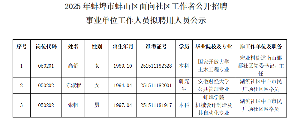 根据《2025年蚌埠市蚌山区面向社区工作者公开招聘事业单位工作人员公告》及《事业单位人事管理条例》等规定,经集中网上报名、统一笔试、面试、集中体检、分别考察等程序,现将考察合格拟聘用人员进行公示,公示期为5个工作日,公示时间为12月23日至12月29日。