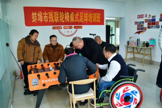 近日,在全国桌式足球队总责任人张杰的帮助指导下,蚌山区残疾人张爱兵带领着一群热爱体育运动的残疾人朋友,组建了“蚌埠市首支轮椅桌式足球队”,这也是全国首支轮椅桌式足球队,这支队伍的成立意味着我区残疾人体育事业有了新提升、新突破。